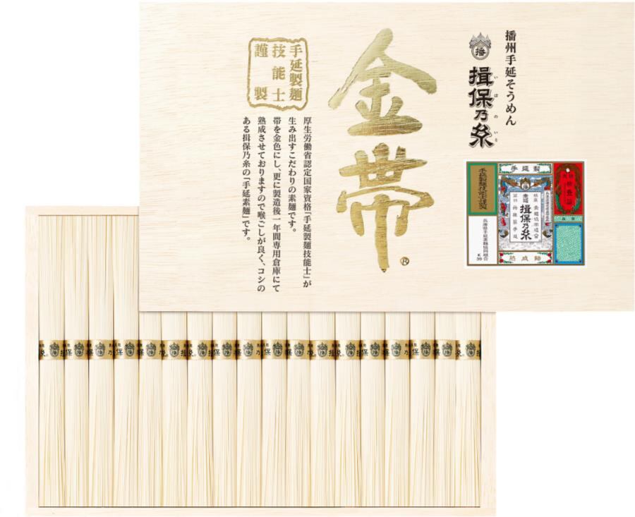 商品内容:手延そうめん揖保乃糸【ひね金帯・熟成麺】50gx18束<木箱入り>