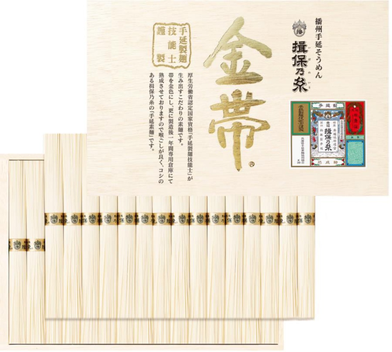 商品内容:手延そうめん揖保乃糸【ひね金帯・熟成麺】50gx30束<木箱入り>