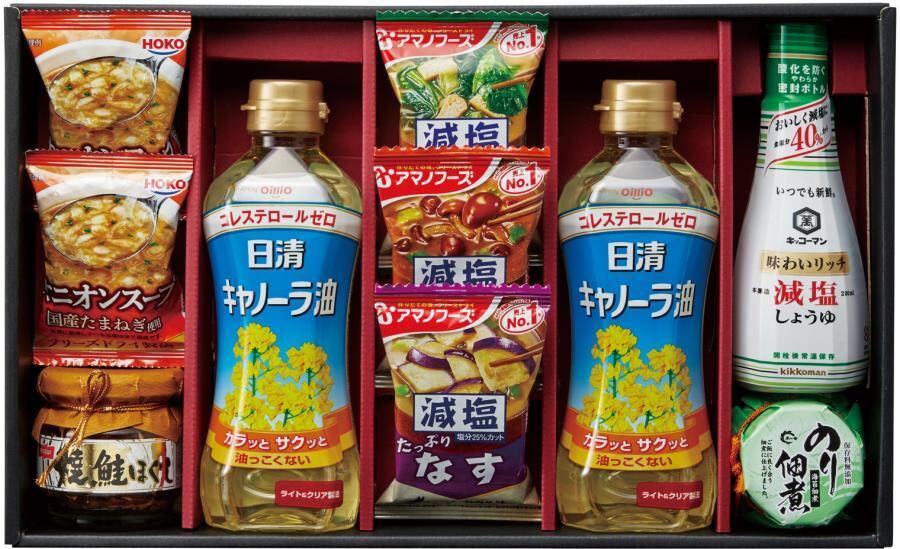 商品内容:日清キャノーラ油350g×2、キッコーマン味わいリッチ減塩しょうゆ200ml×1、アマノフーズ減塩いつものおみそ汁(なす・なめこ・ほうれん草)×各1、島の香 のり佃煮80g×1、ニッスイ焼鮭ほぐし50g×1、宝幸 オニオンスープ×2