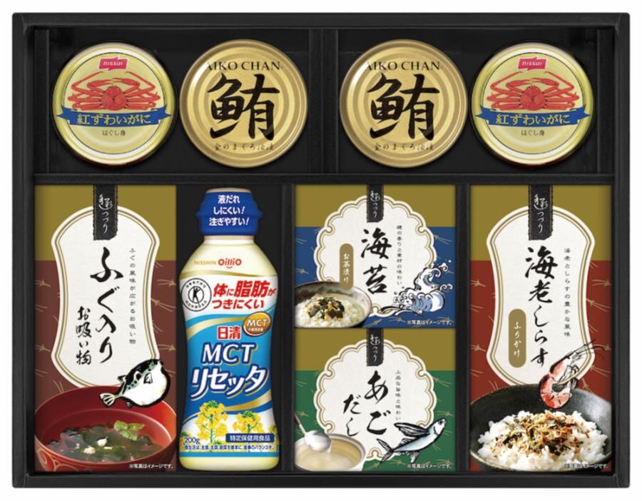 商品内容:日清MCTリセッタ200g・海老しらすふりかけ(3g×3)・海苔茶漬け(5.5g×2)・あごだし(6g×2)・ふぐ入りお吸いもの(3.2g×3)・鮪油漬けフレーク70g×2・ニッスイ紅ずわいがにほぐし身55g×2