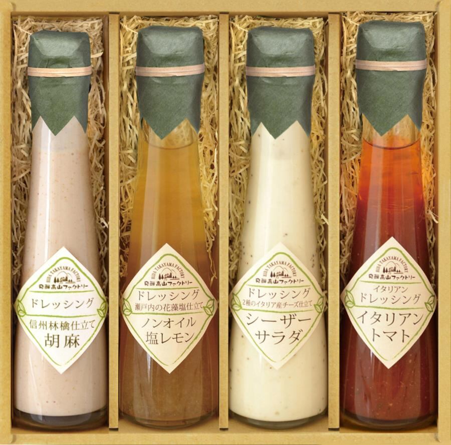 商品内容:信州林檎仕立て胡麻ドレッシング120ml×1本、瀬戸内の花藻塩仕立てノンオイル塩レモンドレッシング120ml×1本、2種のイタリア産チーズ仕立てシーザーサラダドレッシング120ml×1本、イタリアントマトのイタリアンドレッシング120ml×1本
