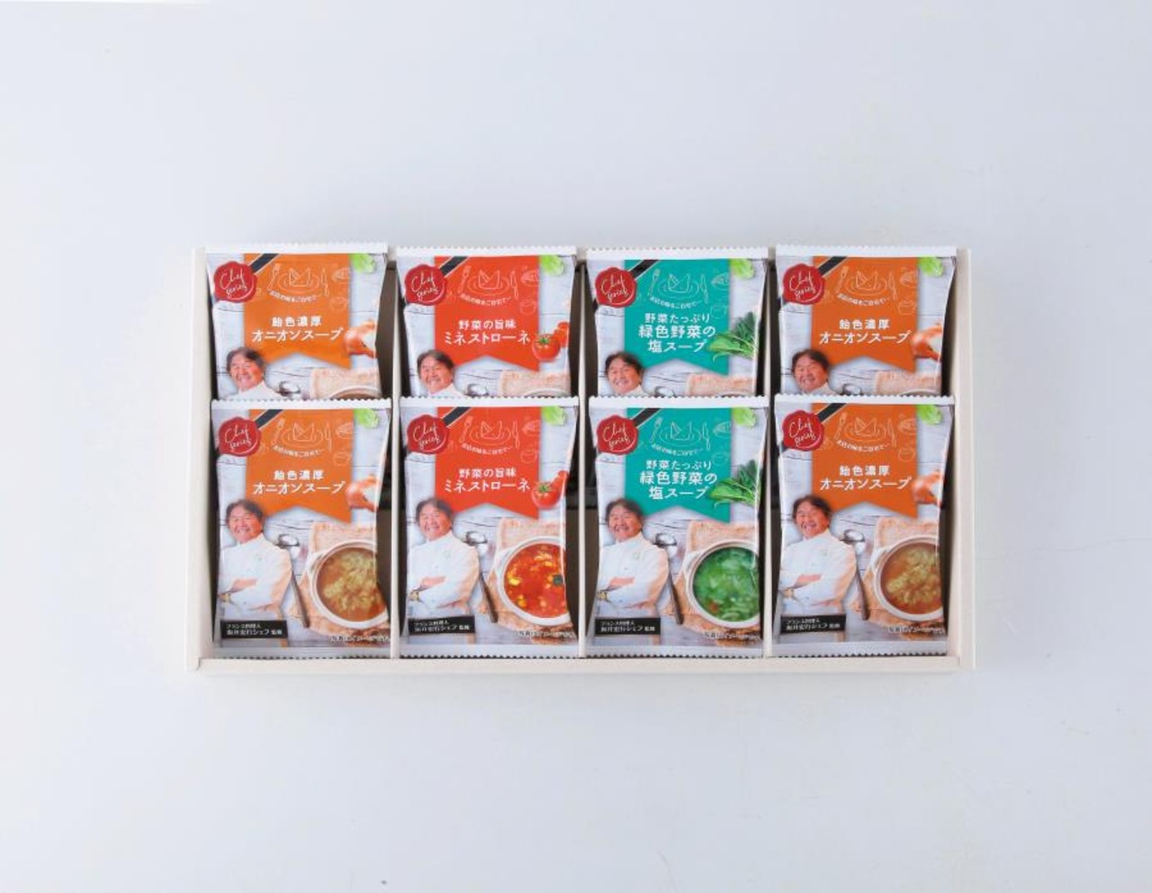 商品内容:オニオンスープ×4、ミネストローネ×2、緑色野菜の塩スープ×2
