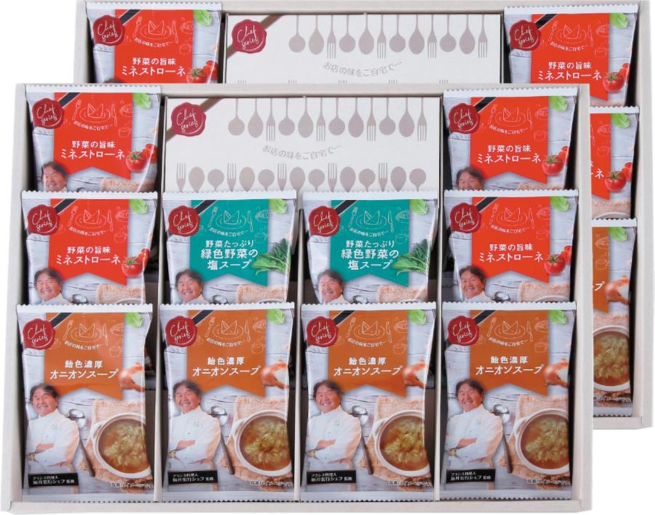 商品内容:オニオンスープ×8、ミネストローネ×8、緑色野菜の塩スープ×4