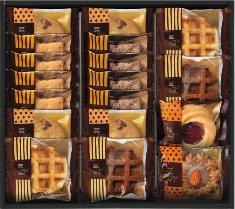 商品内容:ロシアケーキ(ブルーベリーサン、チョコアーモンド)、スクエアパイ(プレーン、ショコラ)×各4・ナッツとチョコのざっくりクッキー×4、ワッフル(プレーン・チョコ)×各2