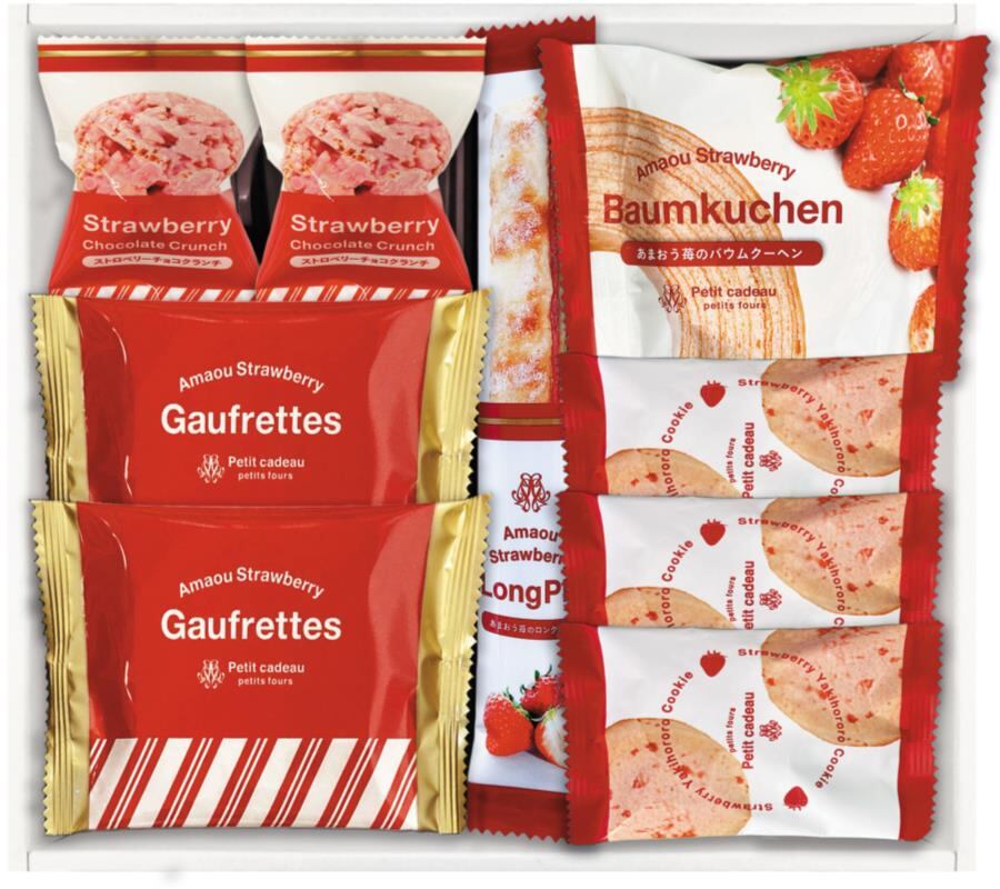 商品内容:あまおう苺バウムクーヘン、あまおう苺ロングスティックパイ、あまおう苺ゴーフレット×2、焼きほろろイチゴクッキー×3、ストロベリーチョコクランチ×2
