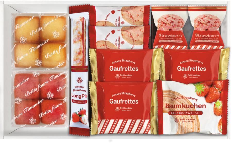 商品内容:あまおう苺バウムクーヘン、あまおう苺ロングスティックパイ、あまおう苺ゴーフレット×3、焼きほろろイチゴクッキー×2、ストロベリーチョコクランチ×2、プチフィナンシェ4個入(あまおう苺、プレーン)