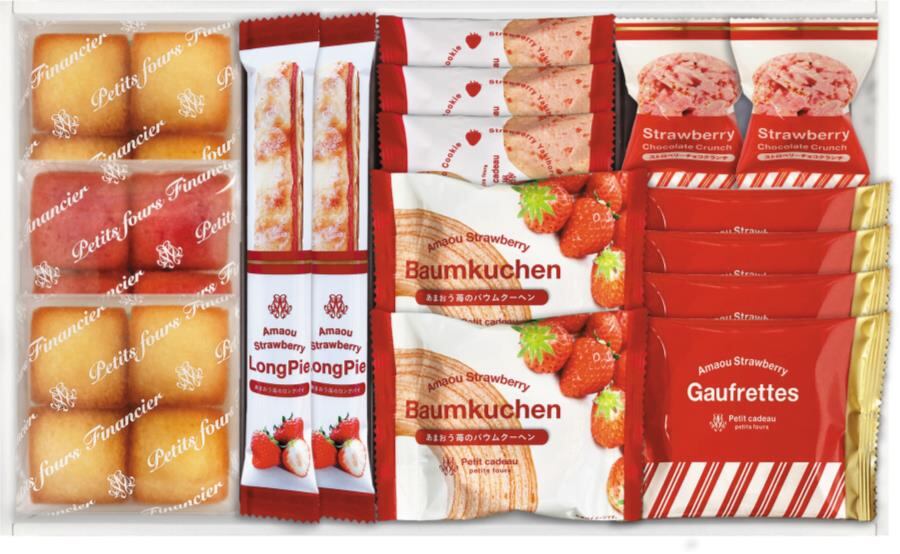 商品内容:あまおう苺バウムクーヘン×2、あまおう苺ロングスティックパイ×2、あまおう苺ゴーフレット×4、焼きほろろイチゴクッキー×3、ストロベリーチョコクランチ×2、プチフィナンシェ4個入(あまおう苺、プレーン×2)