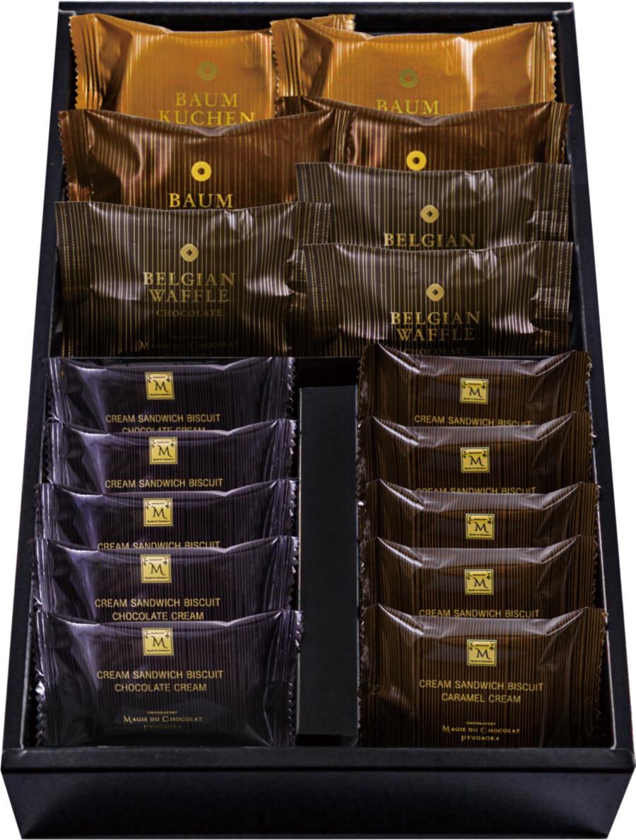 商品内容:ベルギーワッフル(ショコラ)×3個、バームクーヘン(ショコラ・ミルク)×各2個、クリームサンドビスケット(ショコラ・キャラメル)×各5個