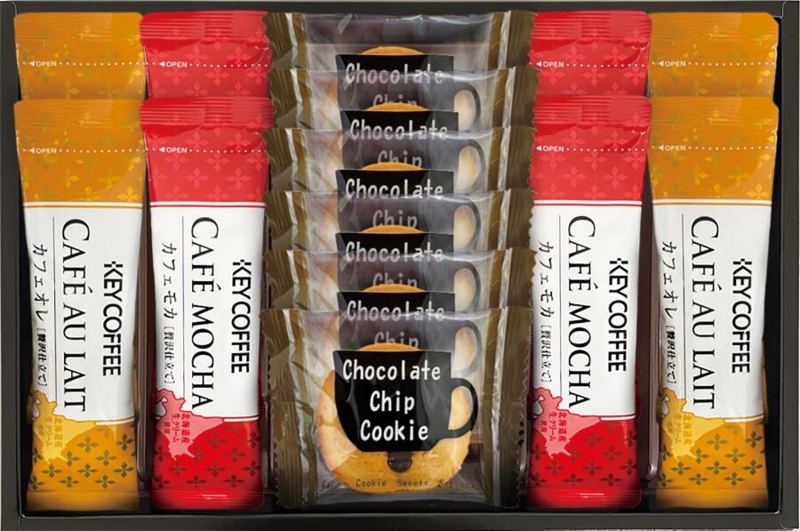 商品内容:チョコチップクッキー×6、キーコーヒーカフェオレスティック7g×4、キーコーヒーカフェモカスティック7.8g×4