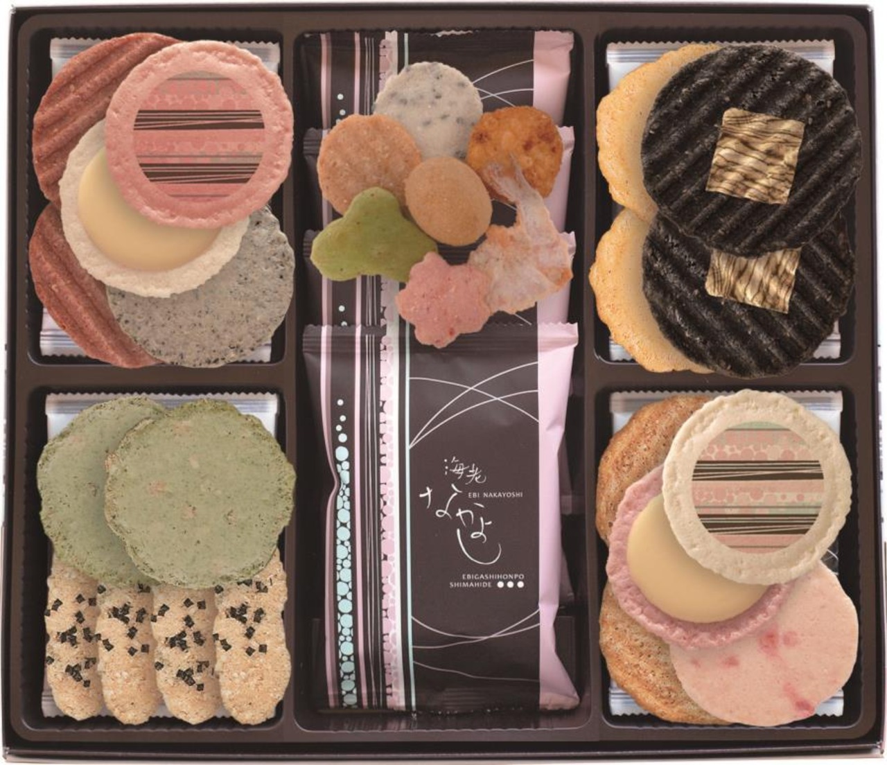 商品内容:えびのだんらん×4袋、ふた焼辛子明太子×3袋、えび柚子胡椒×3袋、黒ごまえび煎餅×2袋、紅白せんべいチーズサンド×4袋、紅生姜えび煎餅×2袋、えび小笹×2袋、ふた焼ごま×2袋、ふた焼イカスミ昆布×3袋、のりえびせん×3袋 計28袋入