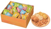 商品内容:柿の種5gx18、柿の種梅しそ5gx18、揚一番1枚x18、小丸せんべいしお味1枚x18、小丸せんべいカレー味1枚x18