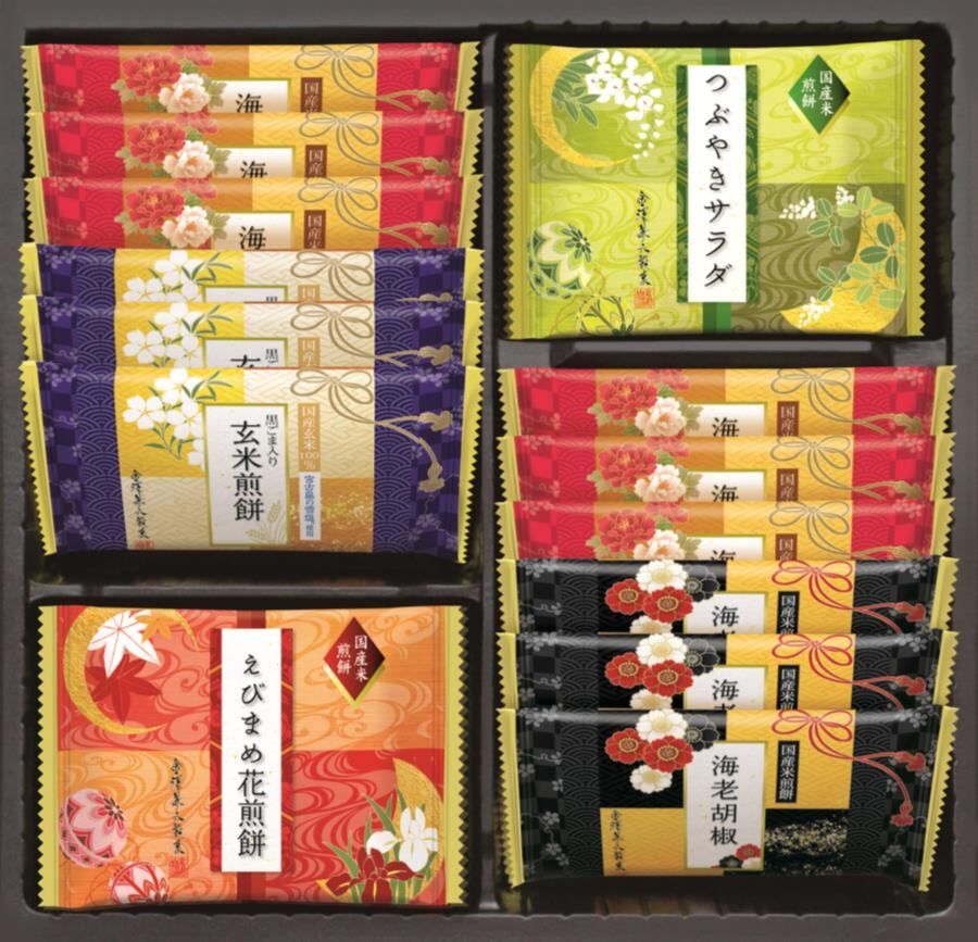 商品内容:海老カレー煎餅×6枚、えびまめ花煎餅×3枚、つぶやきサラダ煎餅×3枚、黒ごま入り玄米煎餅×3枚、海老胡椒煎餅×3枚