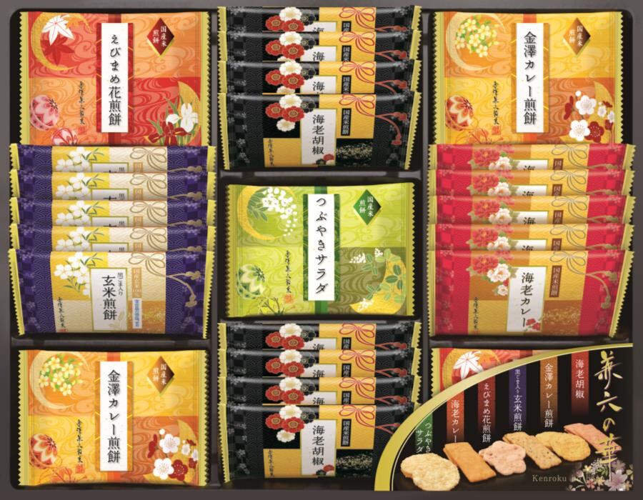 商品内容:えびまめ花煎餅×8枚、金澤カレー煎餅×8枚、海老胡椒煎餅×8枚、海老カレー煎餅×5枚、黒ごま入り玄米煎餅×5枚、つぶやきサラダ煎餅×4枚