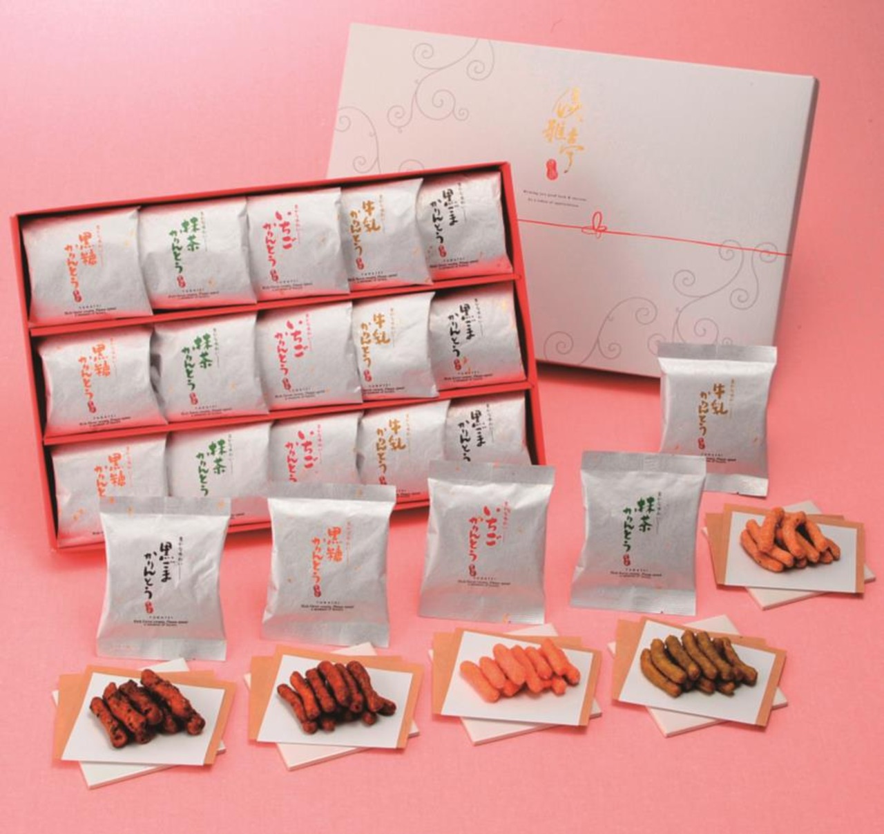 商品内容:黒糖かりんとう10g×3、黒胡麻かりんとう10g×3、牛乳かりんとう10g×3、抹茶かりんとう10g×3、いちごかりんとう10g×3