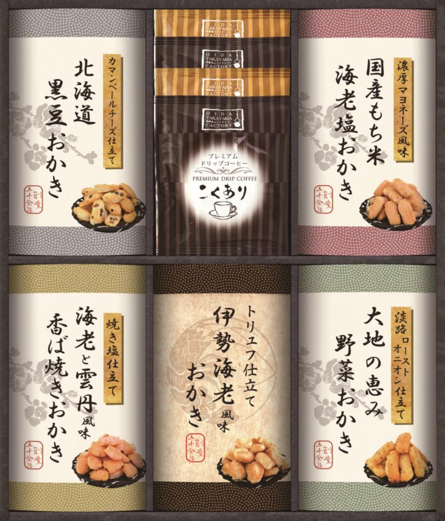 商品内容:トリュフ仕立て伊勢海老風味おかき40g×1個、カマンベールチーズ仕立て北海道黒豆おかき40g×1個、焼き塩仕立て海老と雲丹風味の香ば焼きおかき40g×1個、淡路ローストオニオン仕立て大地の恵み野菜おかき40g×1個、濃厚マヨネーズ仕立て国産もち米 海老塩おかき40g×1個、飛騨高山ファクトリードリップコーヒー(こくあり・まろやか)×各2袋