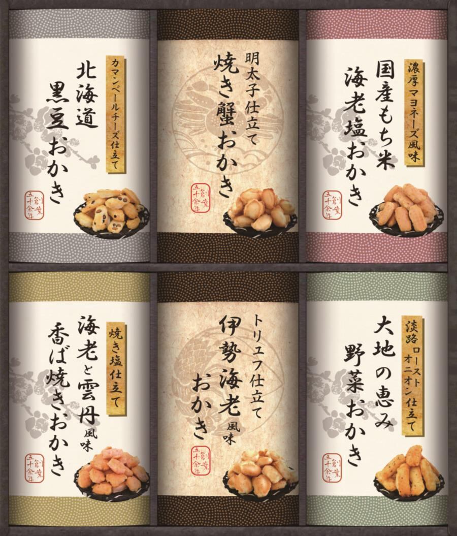 商品内容:トリュフ仕立て伊勢海老風味おかき40g×1個、明太子仕立て焼き蟹おかき40g×1個、カマンベールチーズ仕立て北海道黒豆おかき40g×1個、焼き塩仕立て海老と雲丹風味の香ば焼きおかき40g×1個、淡路ローストオニオン仕立て大地の恵み野菜おかき40g×1個、濃厚マヨネーズ仕立て国産もち米 海老塩おかき40g×1個