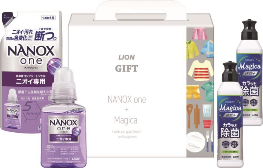 商品内容:NANOX one ニオイ専用本体380g×1、NANOX one ニオイ専用詰替320g×1、Magica速乾+(プラス)カラッと除菌シトラスミントの香り本体220ml×2