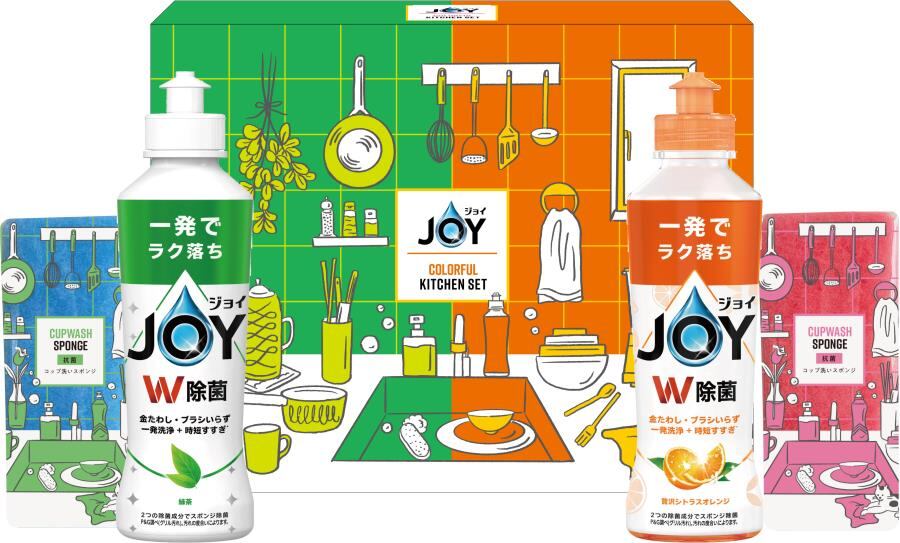 商品内容:除菌ジョイコンパクトオレンジの香り170ml×1、除菌ジョイコンパクト緑茶の香り170ml×1、コップ洗いスポンジ×2(材質:ナイロン〔ソフトタイプ不織布〕、ポリウレタン)