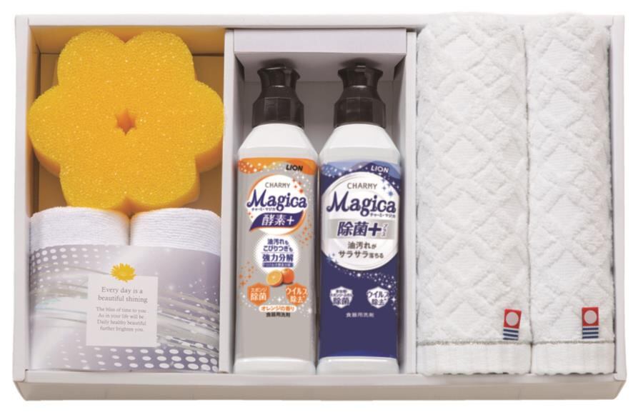 商品内容:チャーミーマジカオレンジの香り×1・チャーミーマジカ除菌プラス×1・フェイスタオル(28×75cm)×1・ウォッシュタオル(28×30cm)×1・マイクロファイバークロス×2・スポンジ×1