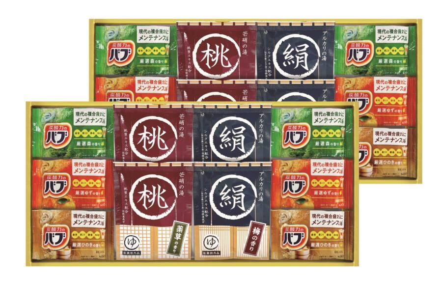 商品内容:バブ(森の香り、ゆず、ひのき 各4)、入浴剤(湯屋めぐり アルカリの湯 絹、芒硝の湯 桃 各4)
