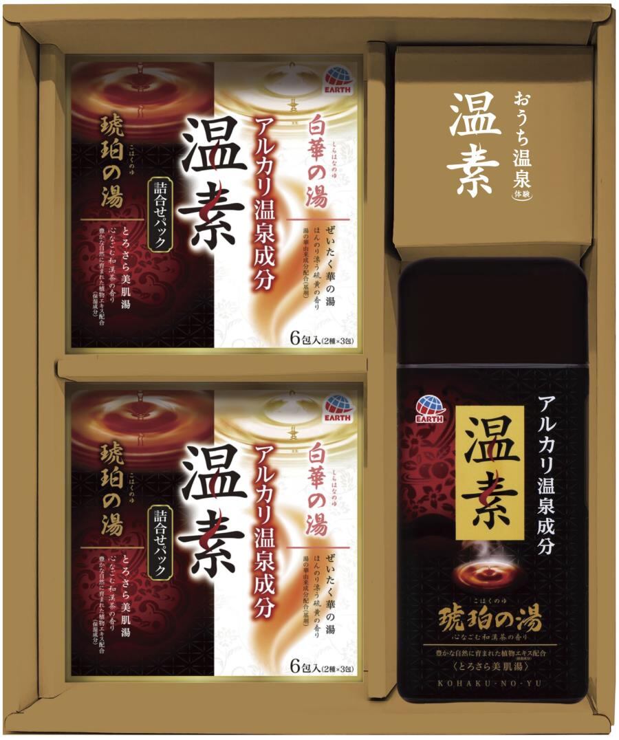 商品内容:温素 琥珀の湯ボトル600g×1、琥珀の湯40g×6、白樺の湯40g×6(医薬部外品)