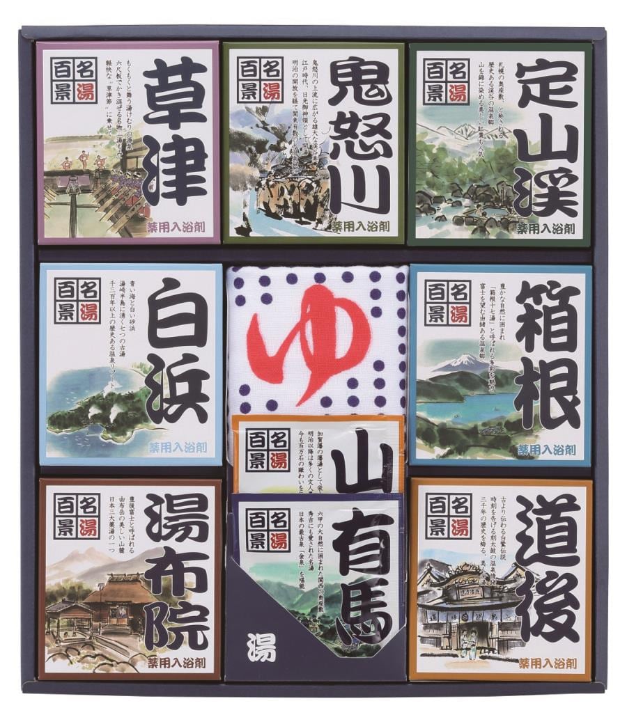 商品内容:入浴剤25g×24(草津、白浜、湯布院、定山渓、箱根、道後)各3、(山代、有馬)各1、鬼怒川×4、ガーゼタオル×1(約26×67cm)