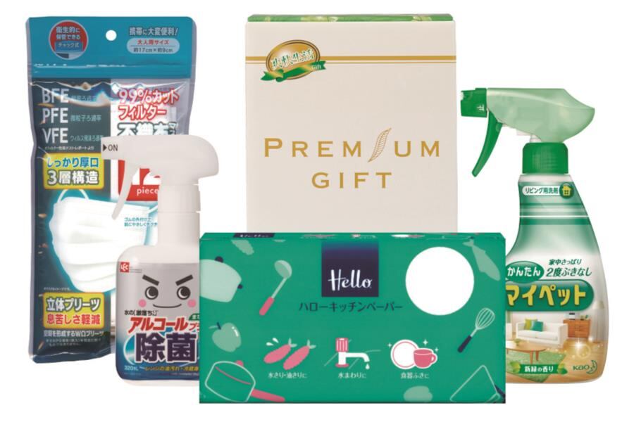 商品内容:花王 かんたんマイペット400ml (本体)、レック 除菌の激落ちくん320ml (本体)、不織布マスク大人用12枚、ハローキッチンペーパー70枚 ×各1