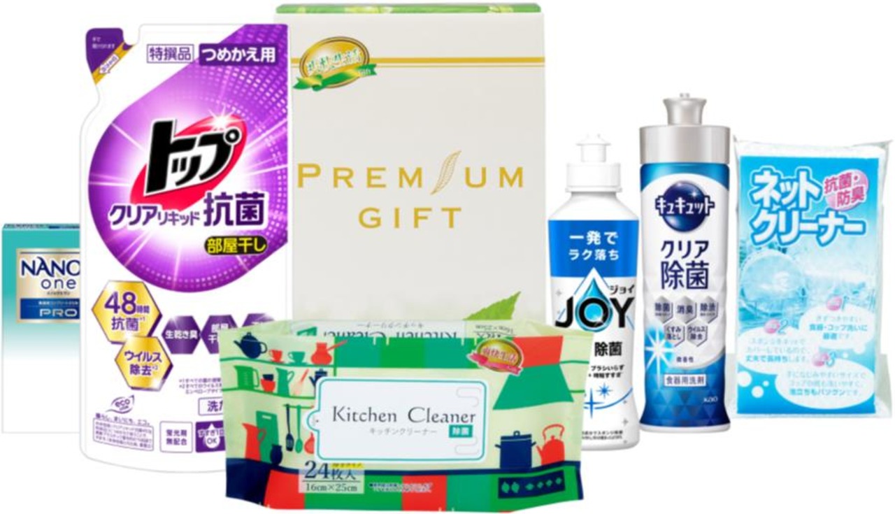 商品内容:ラ イオン トップクリアリキッド抗菌350g詰替、ライオン NANOXonePRO2P、花王 キュキュットクリア除菌220ml、P&G 除菌ジョイコンパクト170ml、キッチンクリーナー24枚、ネットクリーナー1P ×各1
