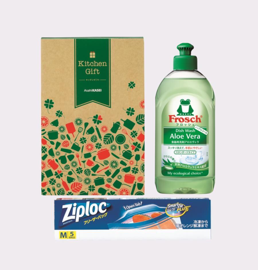 商品内容:ジップロックフリーザーバッグ(M5枚入)×1、フロッシュ食器用洗剤(アロエヴェラ300ml)×1