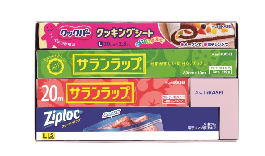 商品内容:サランラップ(30cm×20m)×1、サランラップ(22cm×20m)×1、ジップロックフリザーバッグ(L5枚入)×1、クックパークッキングシート(Lサイズ30cm×2.5m)×1