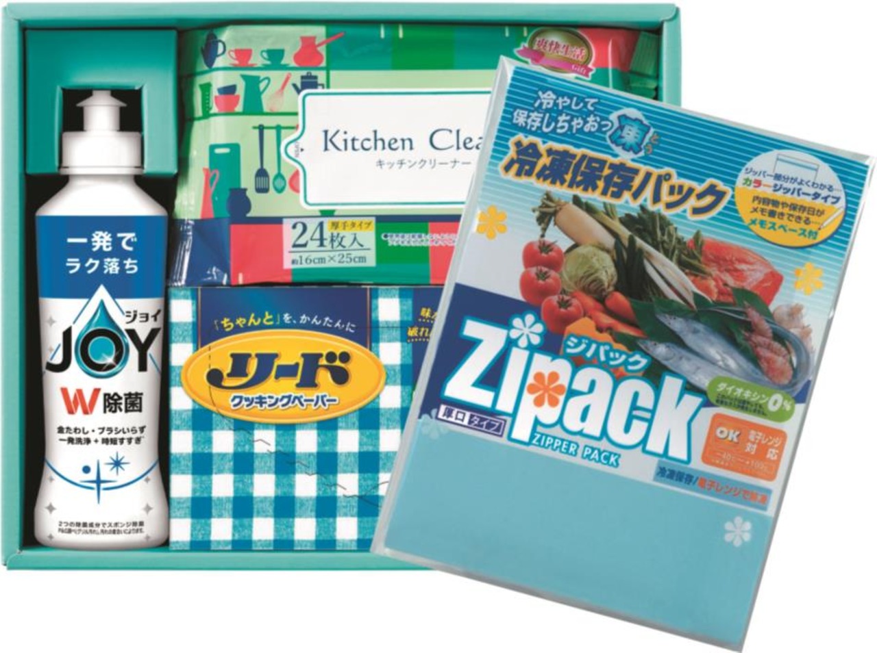 商品内容:P&G 除菌ジョイコンパクト170ml、ライオン リードクッキングペーパー小4枚、キッチンクリーナー24枚、ジパック冷凍保存パック3枚入 ×各1